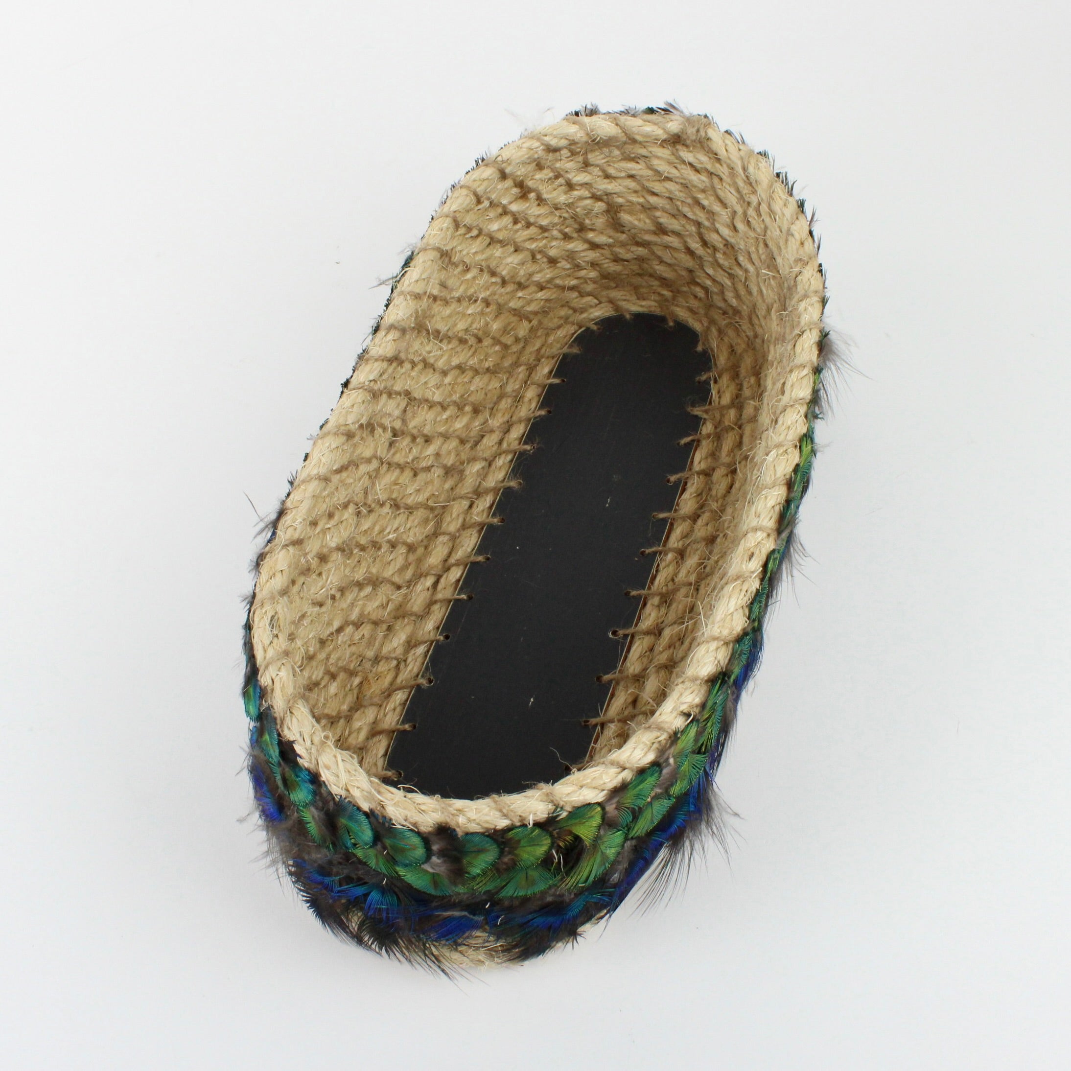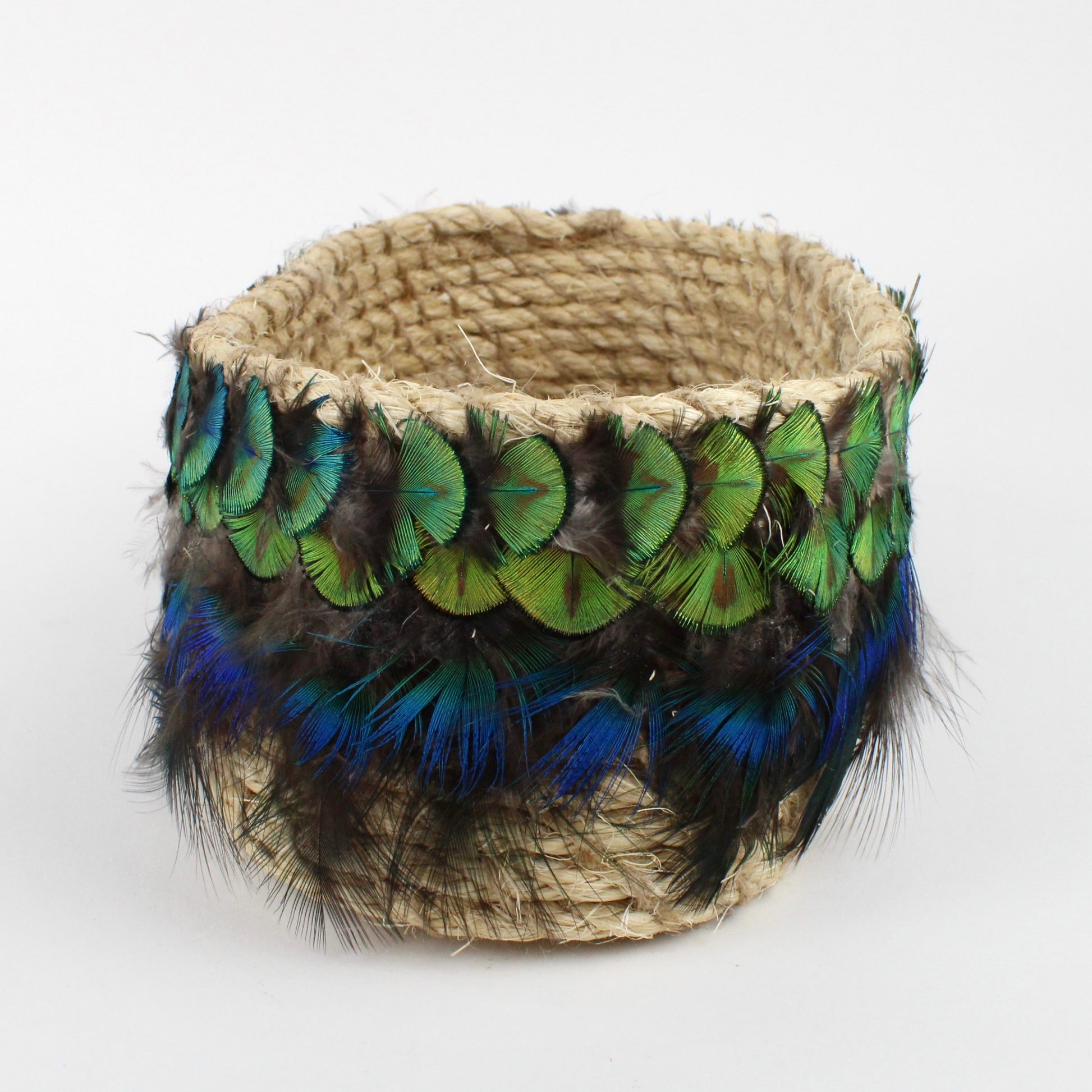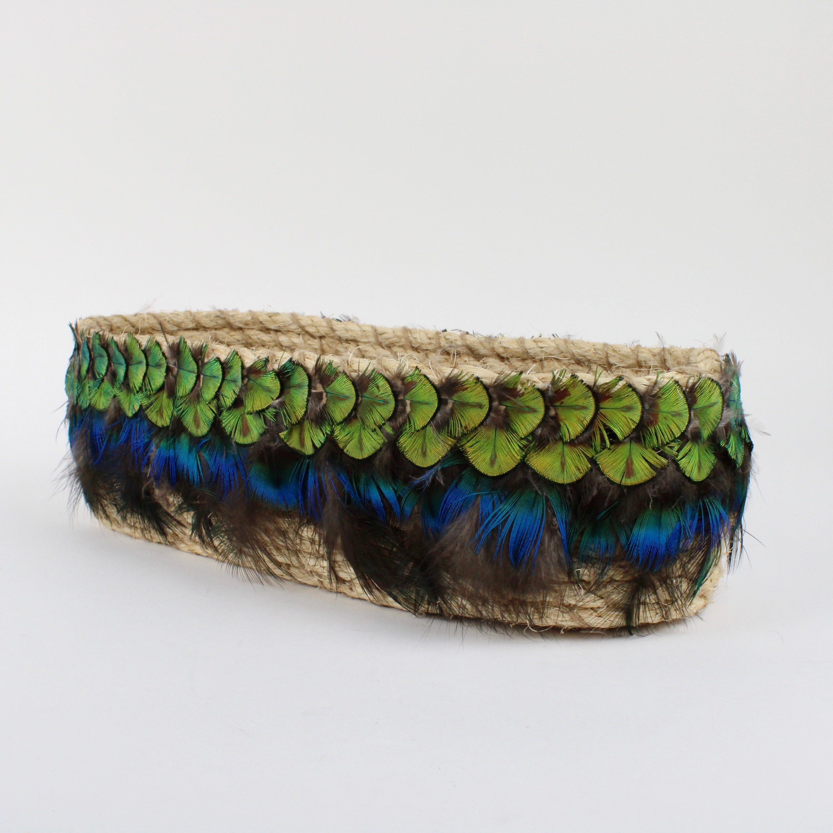Jute rope, peacock and pheasant feathers with a recycled matai timber base