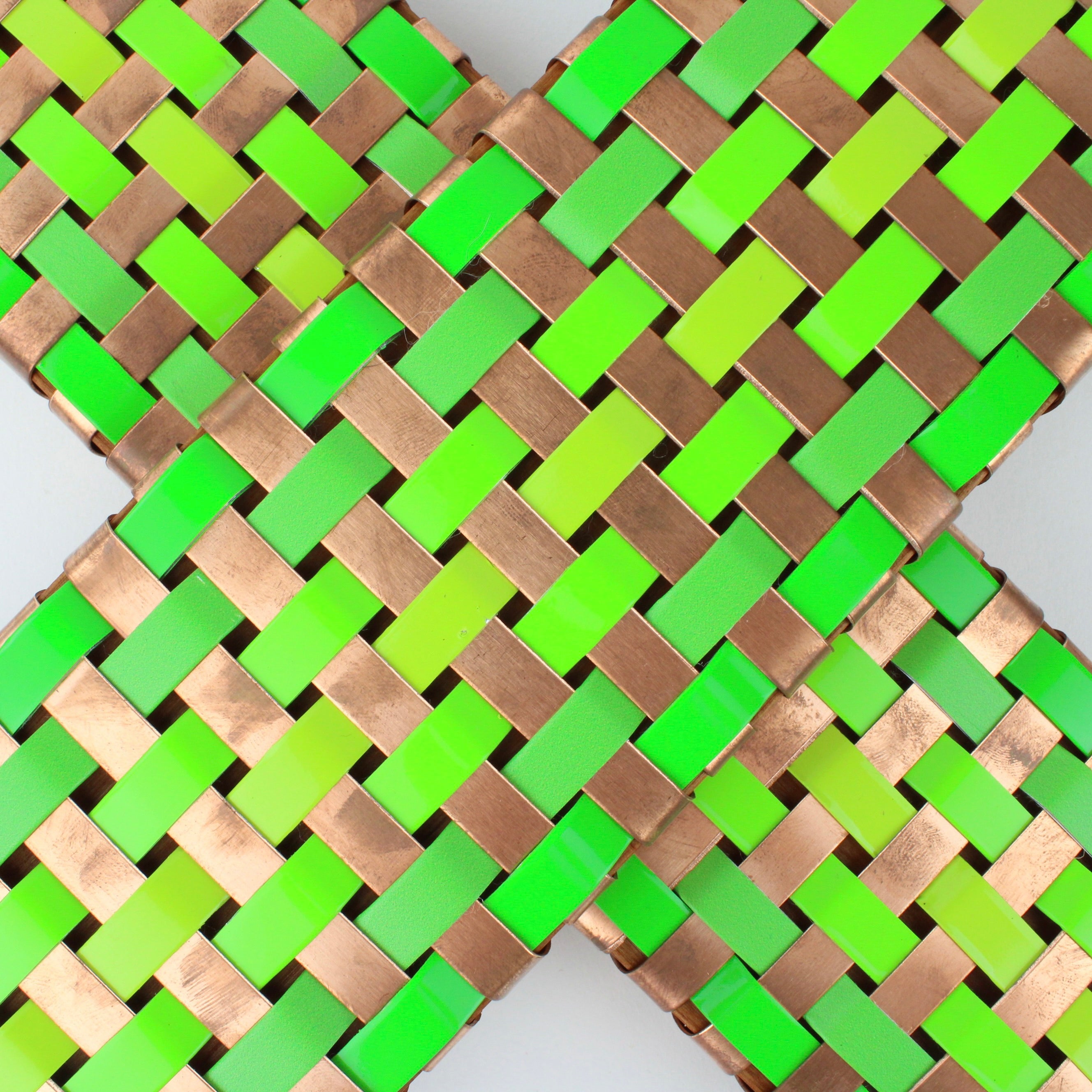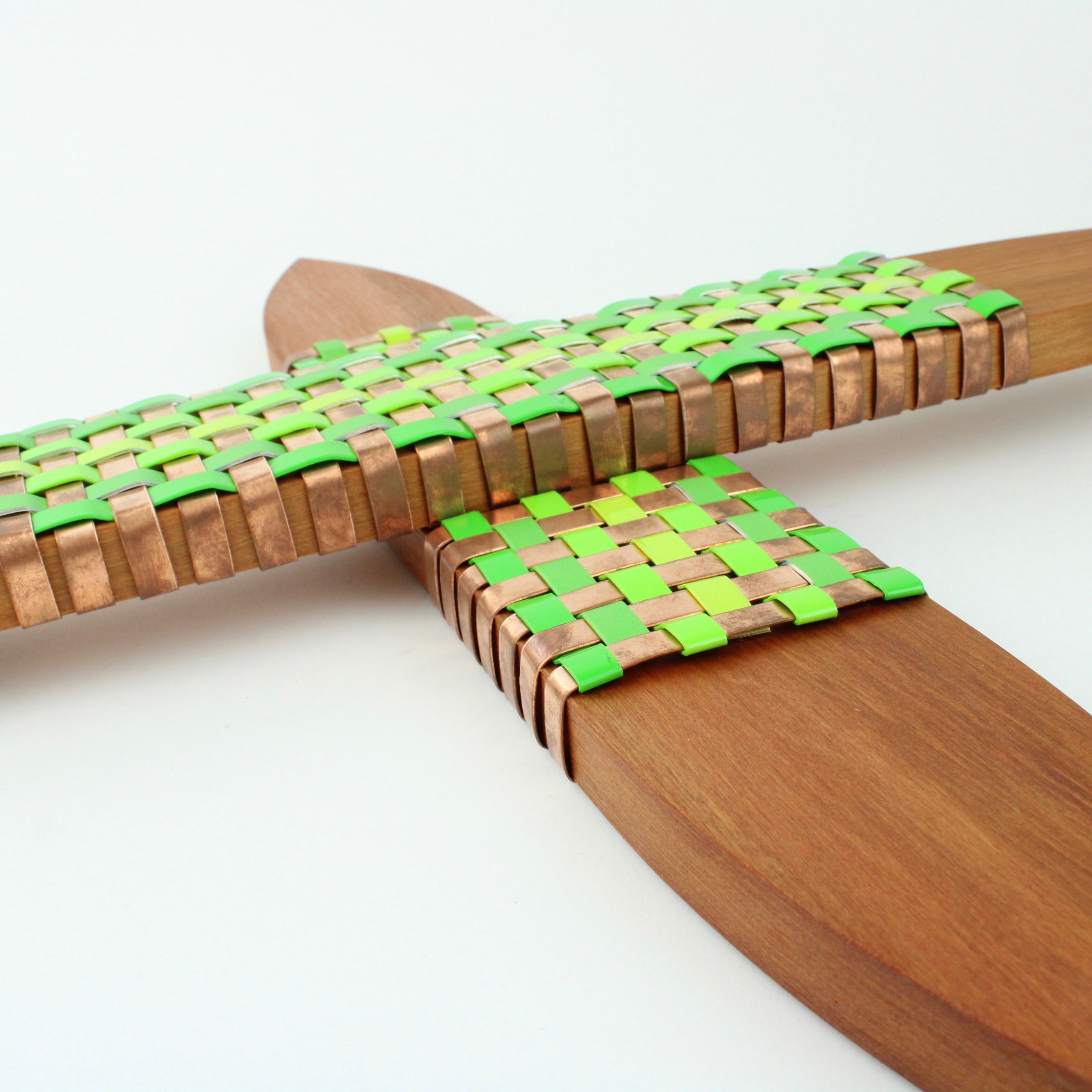Anna Gedson is inspired by her Maori ancestry incorporating contemporary influences. An accomplished flax weaver, Anna enjoys the challenge of designing and creating out of woven metal, seeing how it changes the reading of her works.