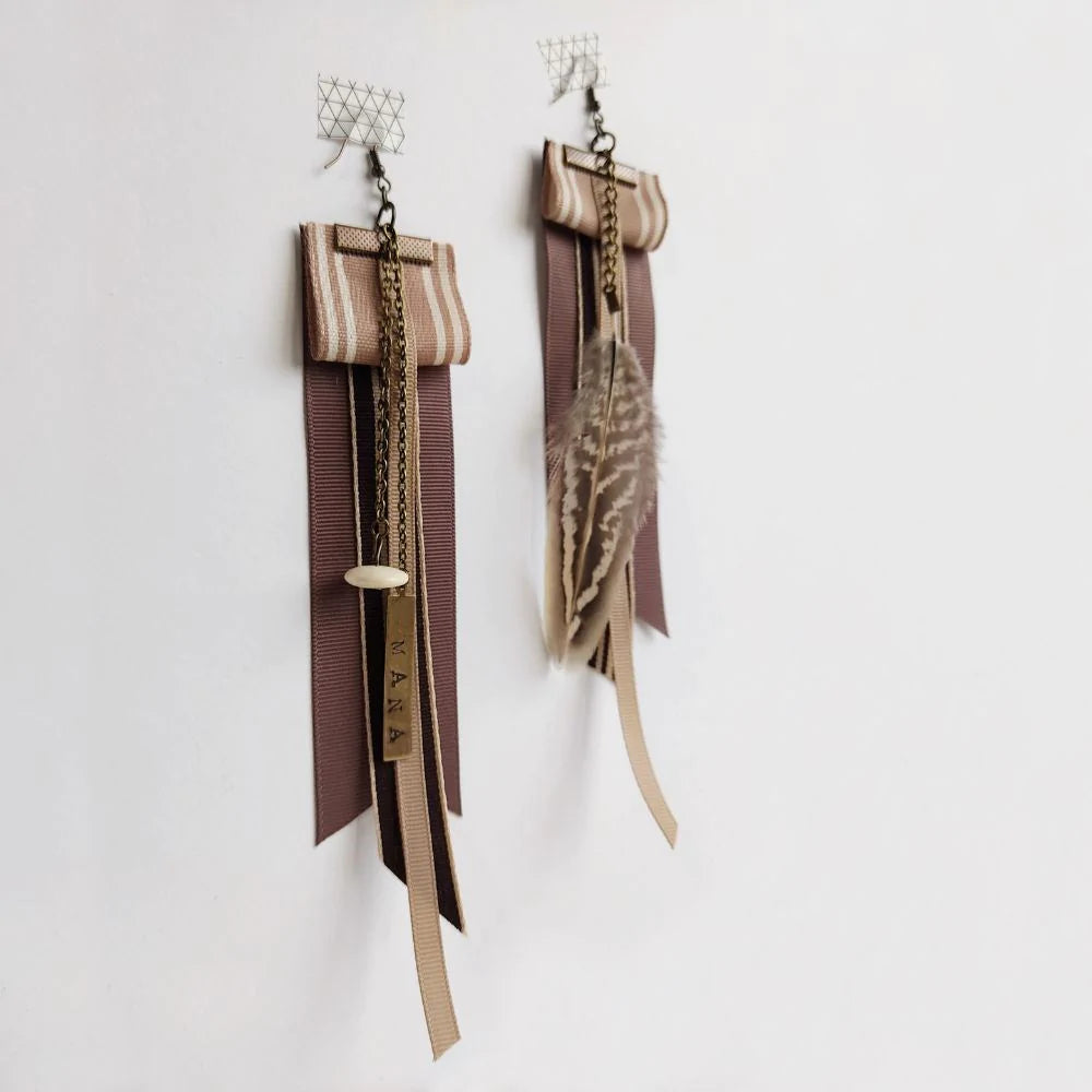 MATERIALS: Grosgrain, hand stamped brass, bone, locally gathered feathers, nickel free antiqued brass plated earring hooks (base metal brass), antiqued bronze ribbon clamp (base metal iron), jumprings nickel free antiqued brass or bronze plated (base metal brass or steel) and/or antiqued brass or bronze plated (base metal steel), antiqued brass or bronze chain (brass or steel base), antiqued brass nickel free foldover ends