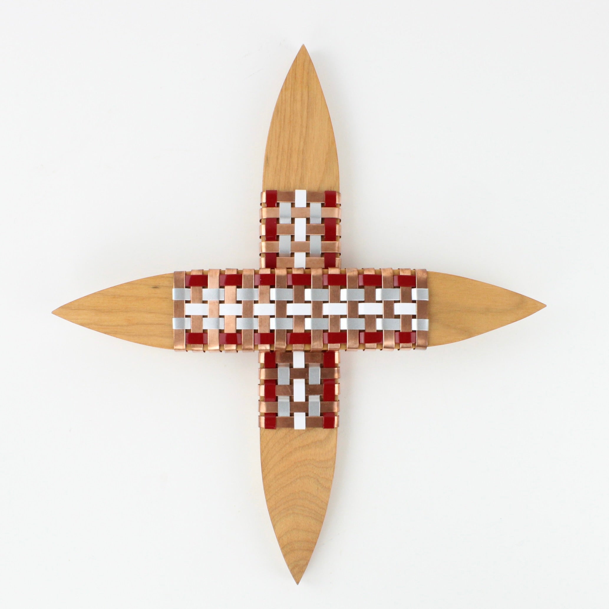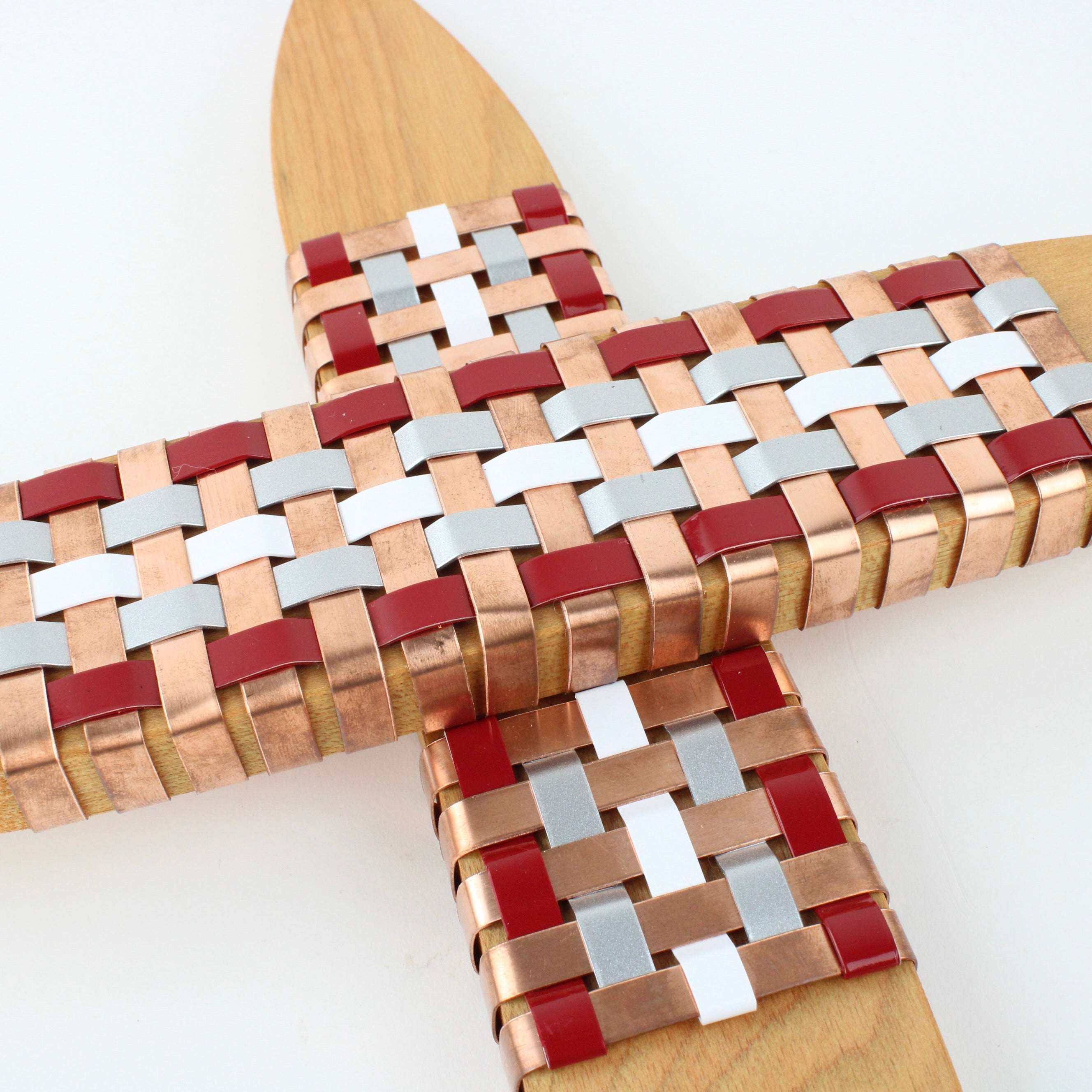 Anna Gedson is inspired by her Maori ancestry incorporating contemporary influences. An accomplished flax weaver, Anna enjoys the challenge of designing and creating artworks out of woven metal, seeing how it changes the reading of her works.