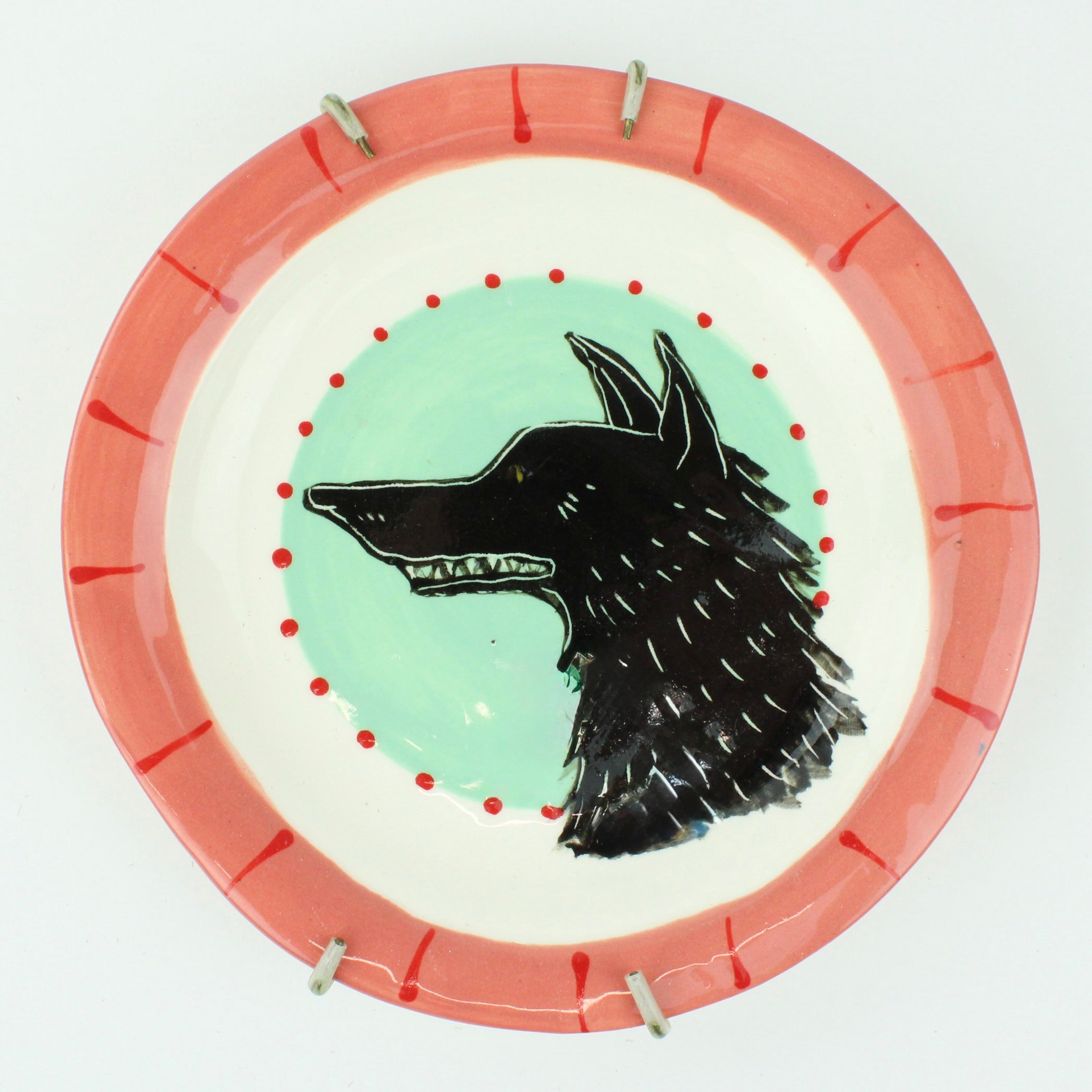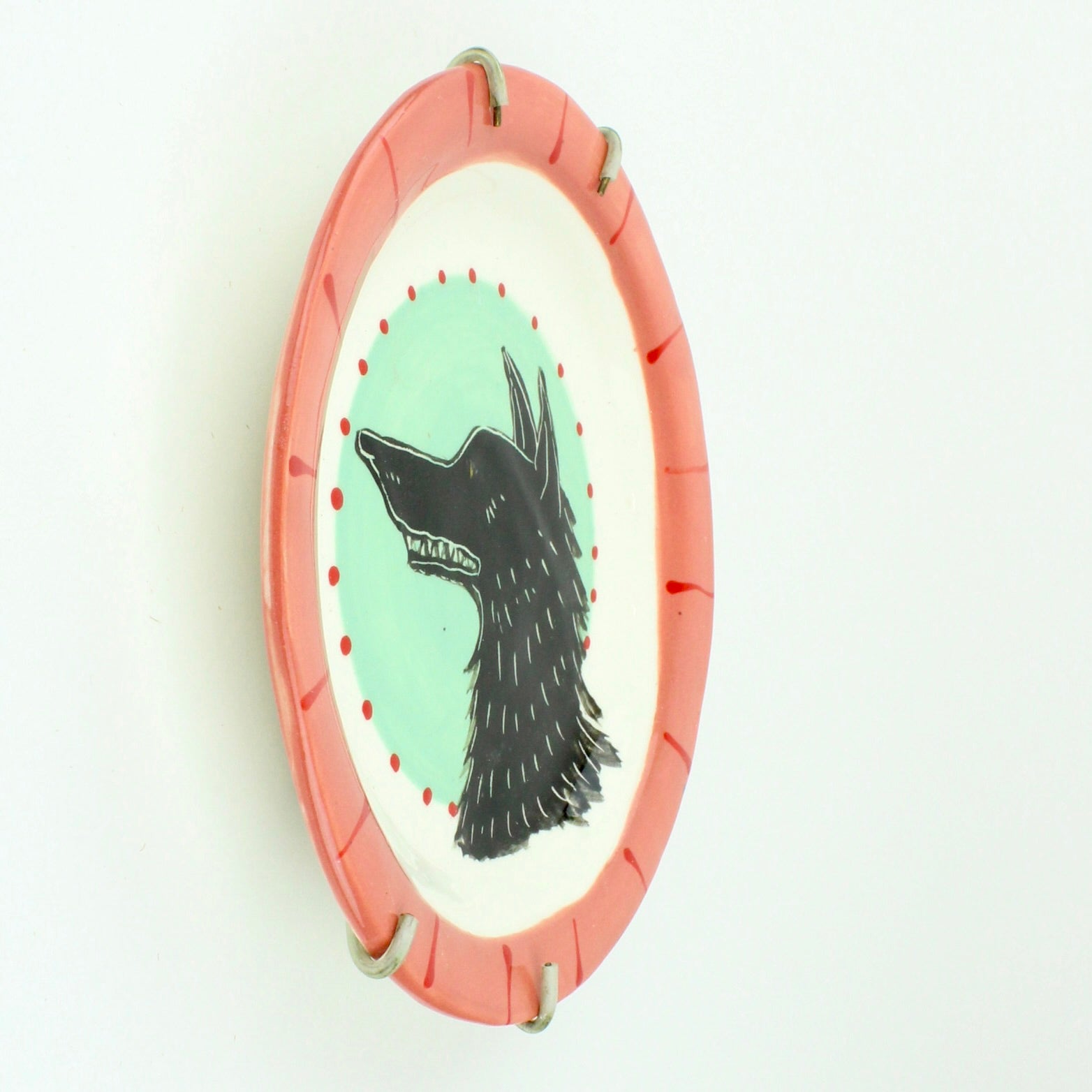 Ceramic plate with attached hanger for wall display