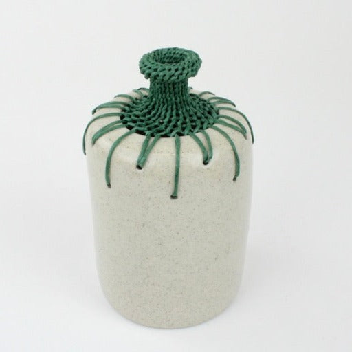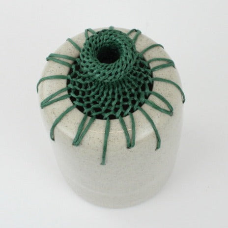 Ceramic vase with woven colourful paper fibre